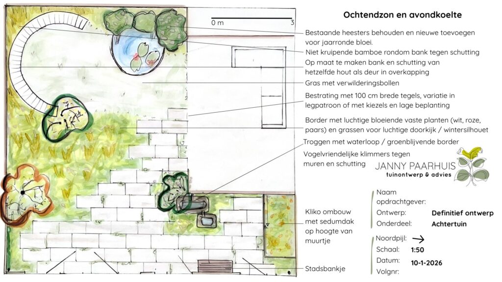 Bestaande bomen en heesters die goed groeien, worden behouden en geïntegreerd in het nieuwe ontwerp. Tegen de bakstenen gevels komen groenblijvende, vogelvriendelijke heesters die de harde lijnen verzachten en jaarrond bloei of bessen geven. De voedertroggen, met hun emotionele waarde, krijgen een nieuwe betekenis. Ze vormen onderdeel van een kleine waterloop in een eigen mini-biotoop.