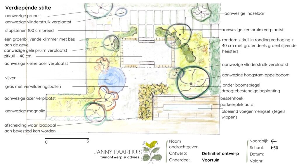 Er ontstaat ruimte om meerdere borders aan te leggen, De huidige bomen en heesters krijgen deels een nieuwe plek waardoor er meer eenheid ontstaat. Met het toevoegen van een kleine vijver wordt de biodiversiteit verhoogd.